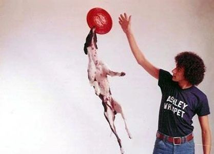 The definitive moment came on August 5, 1974 when Alex Stein, a 19-year-old college student from Ohio, and his dog, Ashley Whippet, jumped the fence at a nationally broadcast baseball game between the Los Angeles Dodgers and the Cincinnati Reds. Stein had with him a couple of flying discs, which he threw for the dog. Ashley astonished the crowd with his disc-catching, as he ran up to 35 miles per hour (56 km/h) and leaped 9 feet (2.7 m) in the air to snag the disc. The stunt was so novel that the game was stopped and Joe Garagiola continued to announce the flying disc action on the field. Finally, after eight minutes, Stein was escorted off the field and arrested. The nationally televised exhibition of Ashley's skill did much to fuel interest in the sport. Stein worked with Irv Lander and Eldon McIntire to create the Frisbee Dog World Championship for people and their dogs. Even today, Stein and McIntire continue to contribute to the sport.